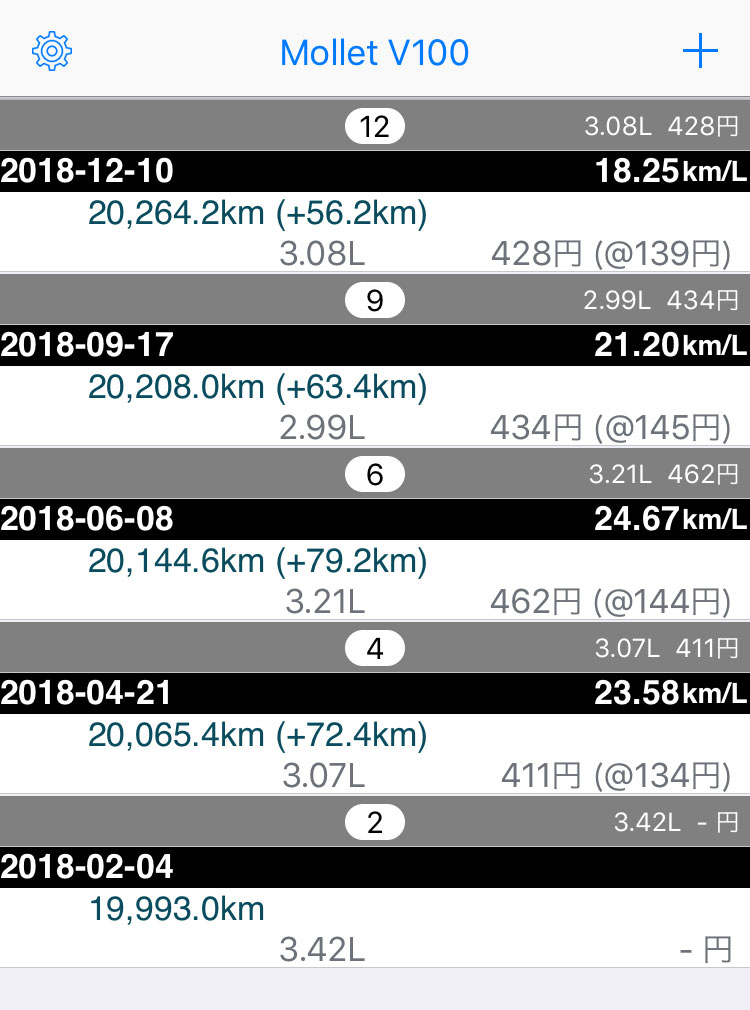 そんで、給油したあとはセレナやJazzと同じようにアプリで記録して燃費を把握したりするんですけども、今回過去最低のリッター18.25kmという数値をマークした。