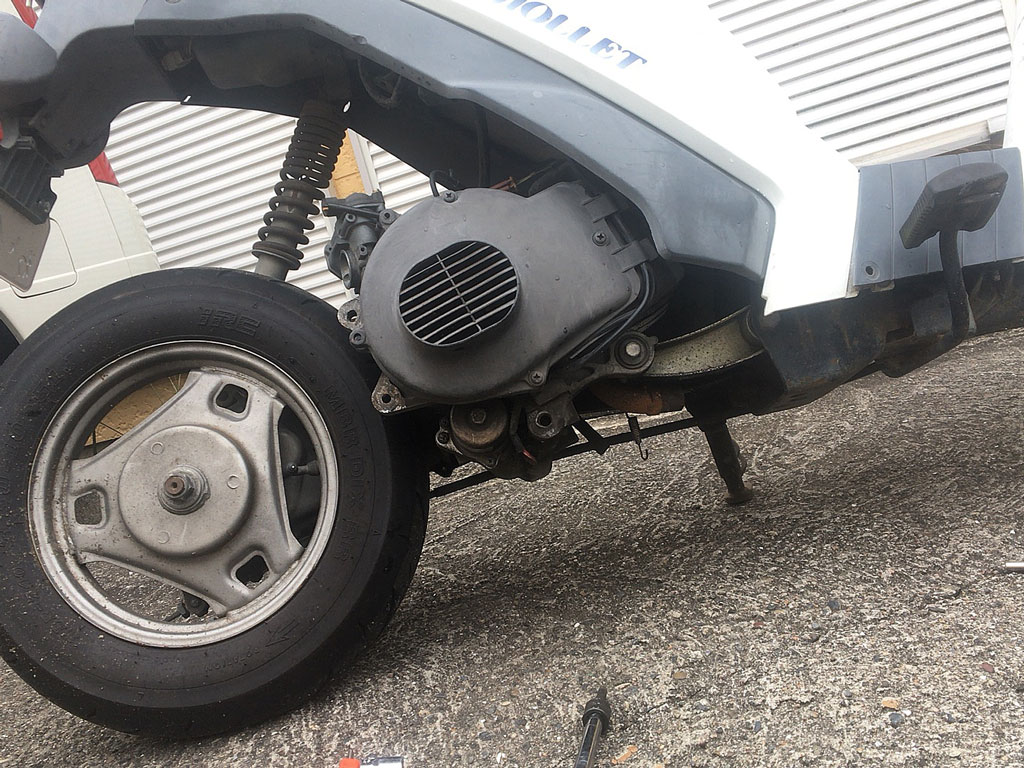 モーターを交換して配線もパチッと繋いで、スクーターのエンジンとはいえ、うっかり住宅地で直管なんて事態にならないようマフラーとエアクリボックスをくっつけてから、動作チェック!
