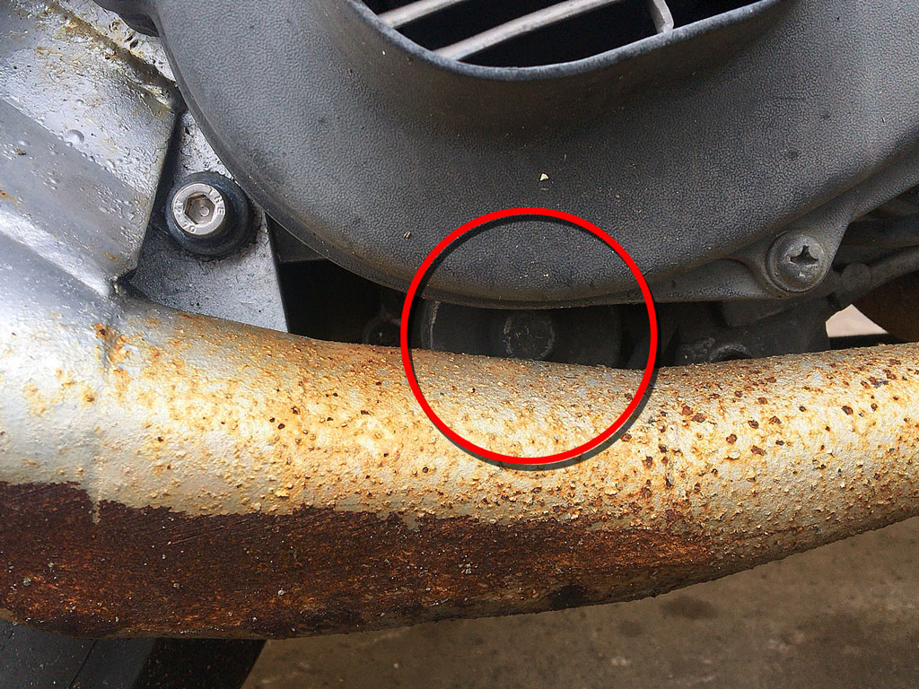 で。アドレスV100のセルモーターはボルト2本とコネクター1本でとまってるだけなので、ささっと交換して快適始動を取り戻すんじゃいっ!!って思ってたんだけど、マフラー外さないと無理だなこれ…。