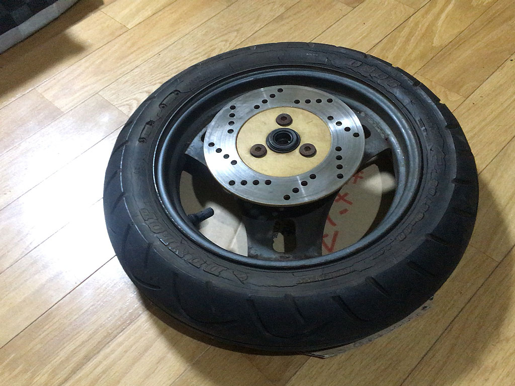 去年探してた時は5,000円から10,000円が相場だったセピア系のフロントホイールなんですけども、今はもっと安価にゴロゴロ出品されていて、それなりにくたびれてはいるものの、商品価格1,300円ちょい。