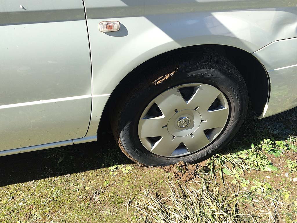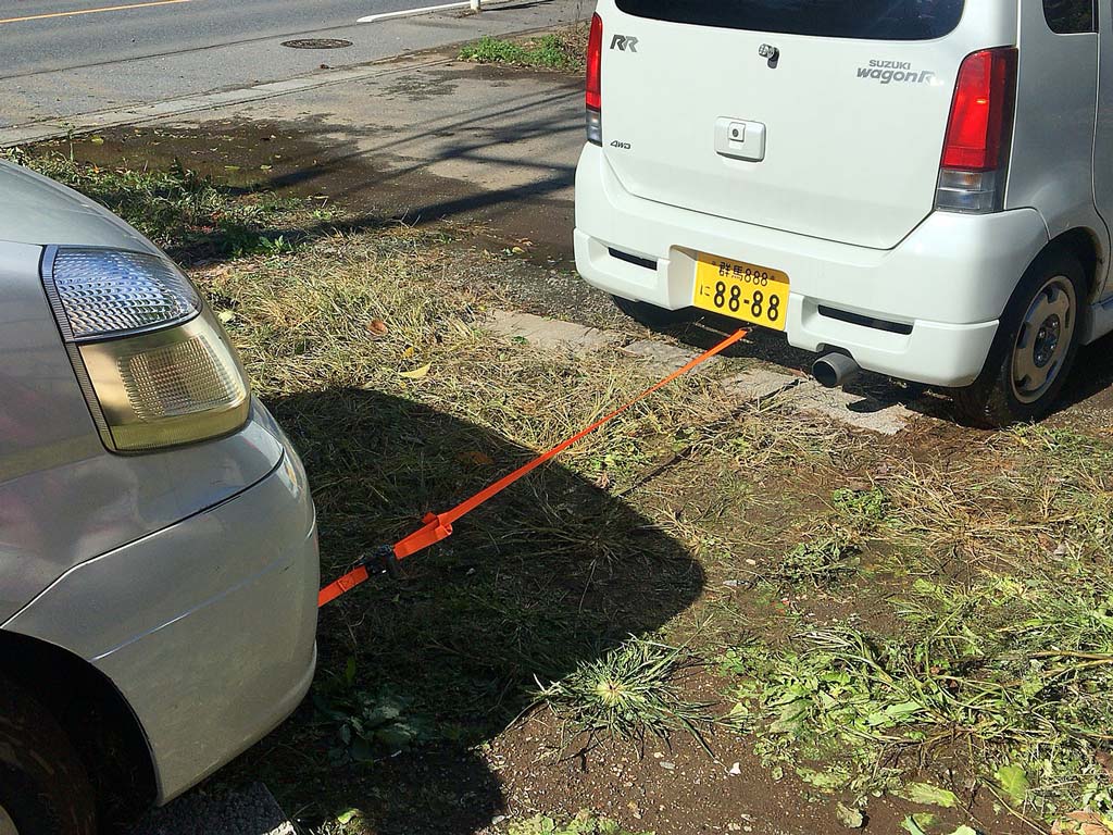 タイヤの下に砂を撒いてみたり乾いた薄いブロックを叩きこんでみたりいろいろやってみたのだけど、工場長パワーで押してもらってもまったく脱出できる節がないので、工場長のワゴンRで引っ張ってもらって漸く脱出。