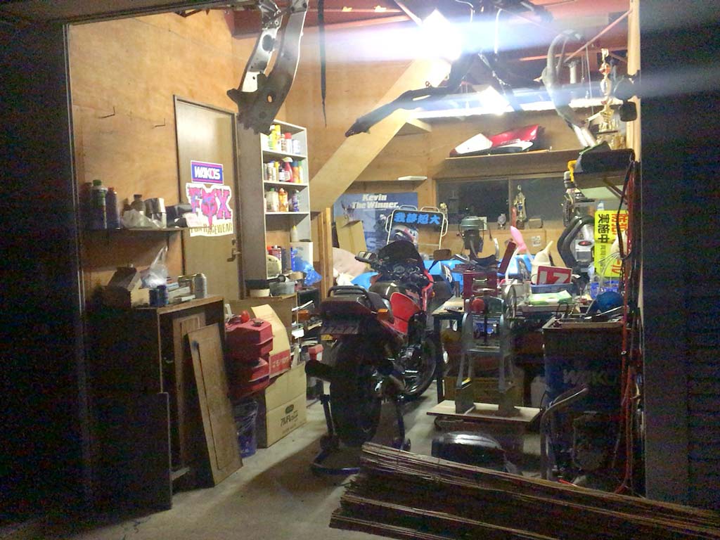 で、こちらの社長さんは僕と歳も近く、クラッシュパッドを制作されているだけあってバイク好きな方で、工場内にもGPZ900Rの車体やFZR400Rの部品取りエンジンがそれとなくちりばめられたりしていたりするのですが、敷地内の別の場所にあるガレージの一角がまさに多くのバイク乗りの憧れか!と言わんばかりのやんちゃなスペースになっていました。