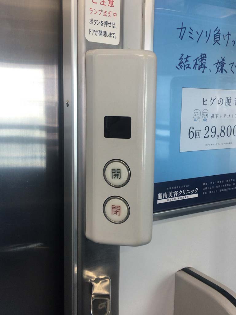 電車のドアを自分で開けたり閉めたりできるスイッチ。
