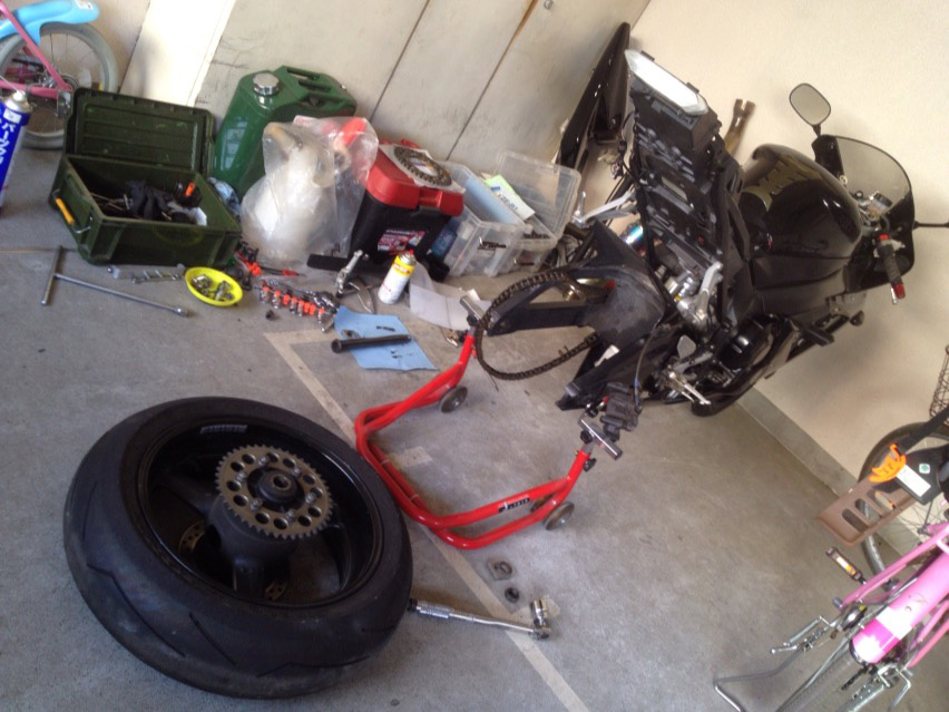 そもそもVFRなんかリアのタイヤセンターナットひとつ外せばポロっと取れるし、スプロケ交換に至ってはタイヤを外す必要すらねぇし…。