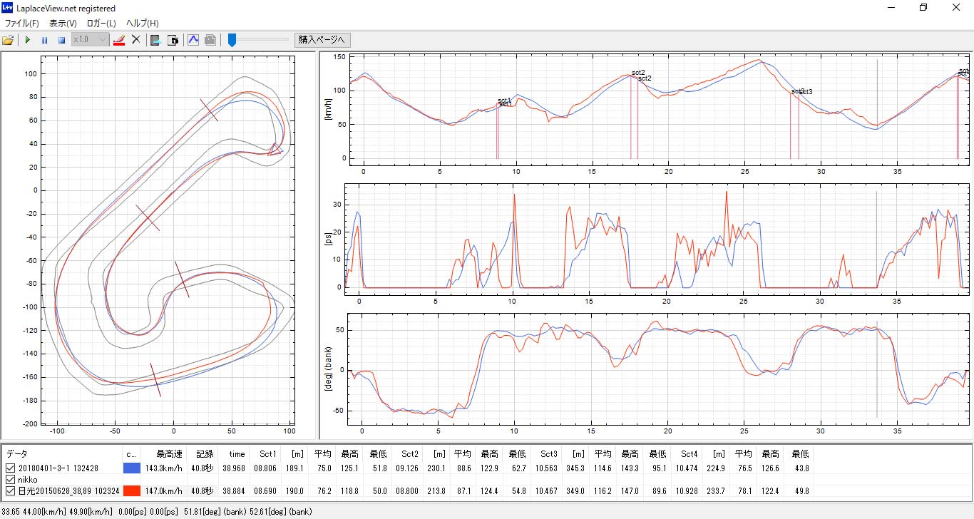 ここからが例の日光サーキットのコース改修によるところの差で、まずライン。