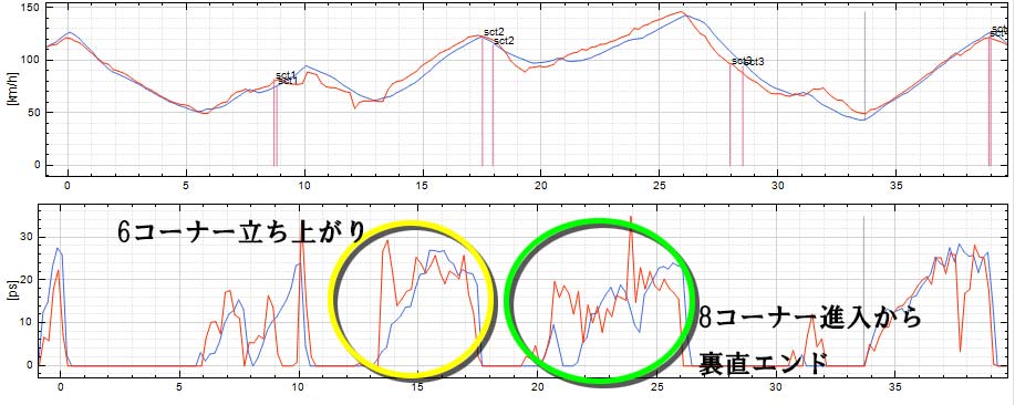この区間のタイムは他の周でもっと出てるのもあるんですけども、このデータで比べると裏直エンドからスタートラインまでで0.4秒以上削ってますね。