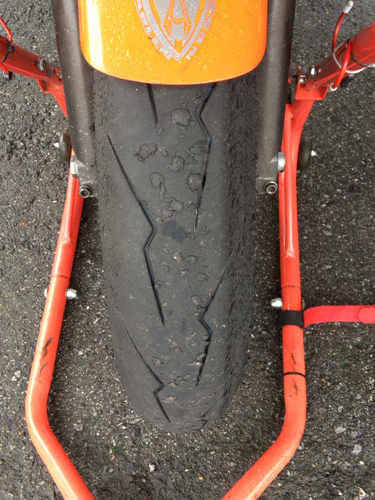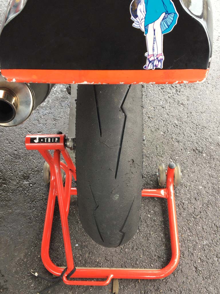 今日は天気に関係なく午前中はNSR80、午後からVFRっていう感じで走ろうと決めていて、予報と雨雲レーダーを見る限り午後からはドライで走れる可能性がかなり高いと見込んでいたので、朝イチでVFRのタイヤを前後逆履き。