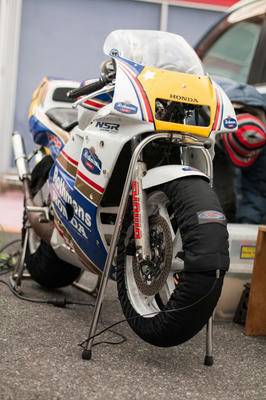 今日はMC1821と最近公道用に組んだMC21のどちらで来るのか直前まで迷ってたようなのだけど、公道用のNSR250RSPになった様子。