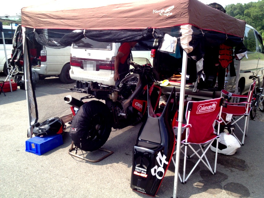 僕の拙い説明で混乱してしまうトコなのでしょうけども、何の迷いもなくキャブを外していろいろやってくれているのを『頼もしいなぁ…さすがプロだなぁ…』なんて思いつつ、僕はと言えばあまりの暑さにツナギを脱いでインナーも脱いで、半裸でくつろいでたら汗が冷えてお腹が痛くなる始末。