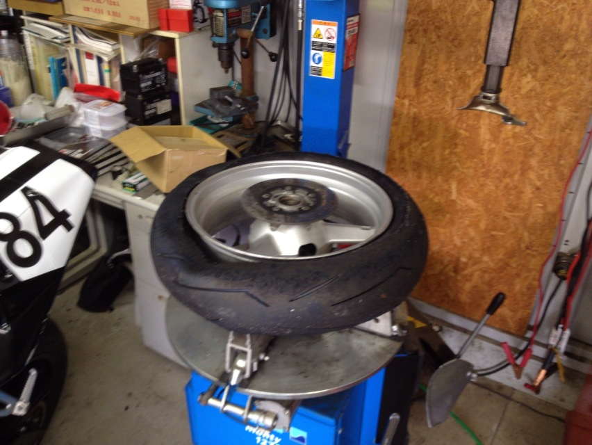 ってコトで、一昨日の日曜日はフクドナルド監督のガレージで練習タイヤに交換したりとか。