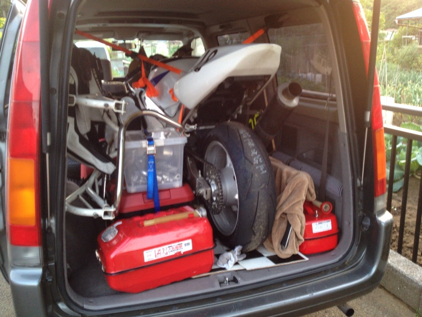 監督が次の日光チャレンジロードで走るバイクの整備の邪魔をしたり、ほりっく部長が何やら整備してるのを冷やかしたりしつつ、暗くなる前にGSX-Rをトランポに積み込んでおきます。