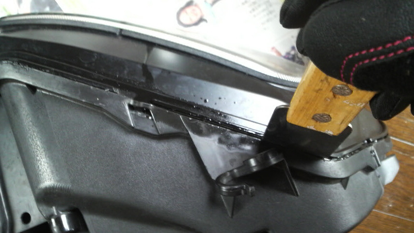 そんなこんなで再度うすめ液の登場で、ヘッドライトユニット側の溝にうすめ液を塗っては放置し、放置してはマイナスドライバーでコーキング剤を剥ぎ取りっていうのを繰り返した結果、なんだかんだと良い感じになりました。