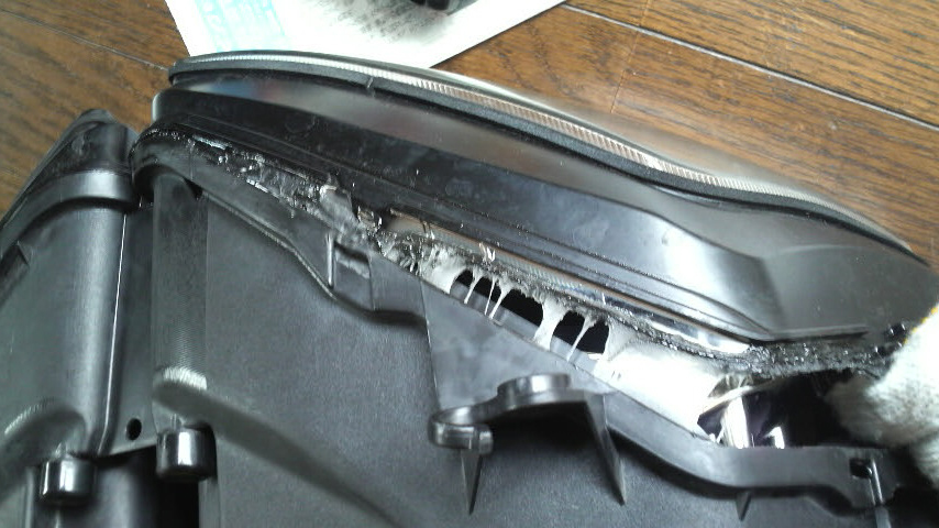 あとは交換する側のレンズ(ジャンク品の左レンズ)も同じ要領ではずしてコーキング剤を剥がします。