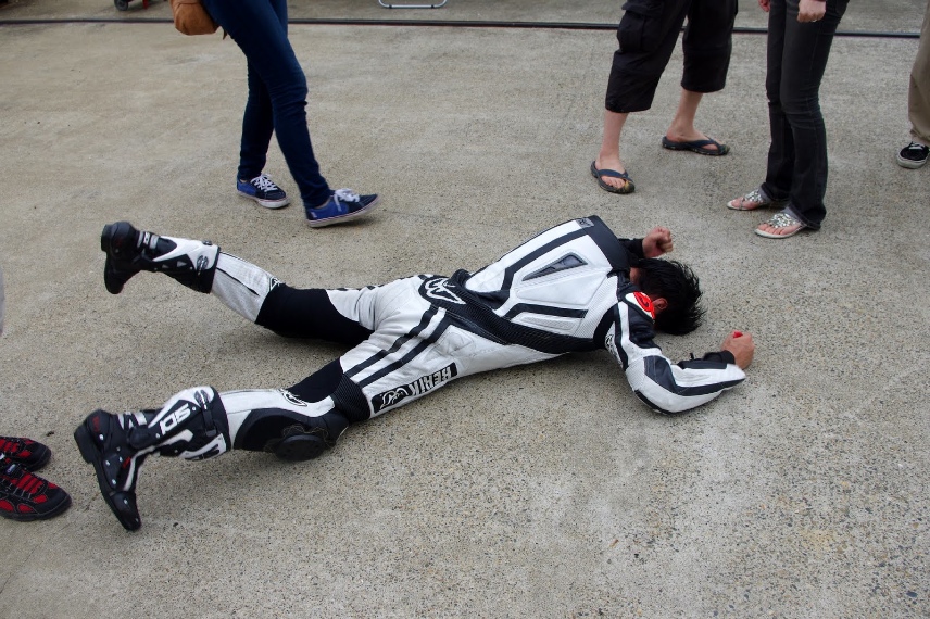 10周っていう長いような短いようなレースが終って、ホームストレートのパドック上で自分のチームの皆が飛び跳ねて喜んでくれてるのが嬉しくて、少しニヤニヤしながら1コーナー、S字、1ヘアと流して行ったら、ダンロップでエビマヨさんと(ごめんなさい、まだご挨拶させていただいていないのですが)もう1人の方が両手を上げて飛び跳ねているのが目に入って、僕の嬉しいメーターを振り切って危うく泣きそうになってしまいましたよf(^_^;)