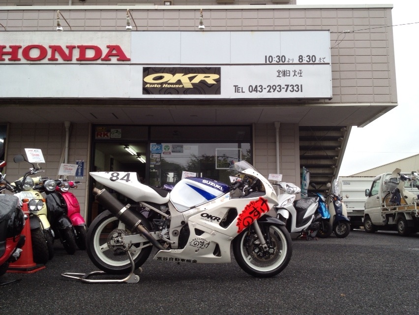 とにかく僕としては、優勝コメントと写真がちょっとしたトコに載るってコトで、モトカンさんのガレージにR600を返す前に、ここ暫くホントにお世話になりっぱなしのOKRの店先で写真を撮りたかった。