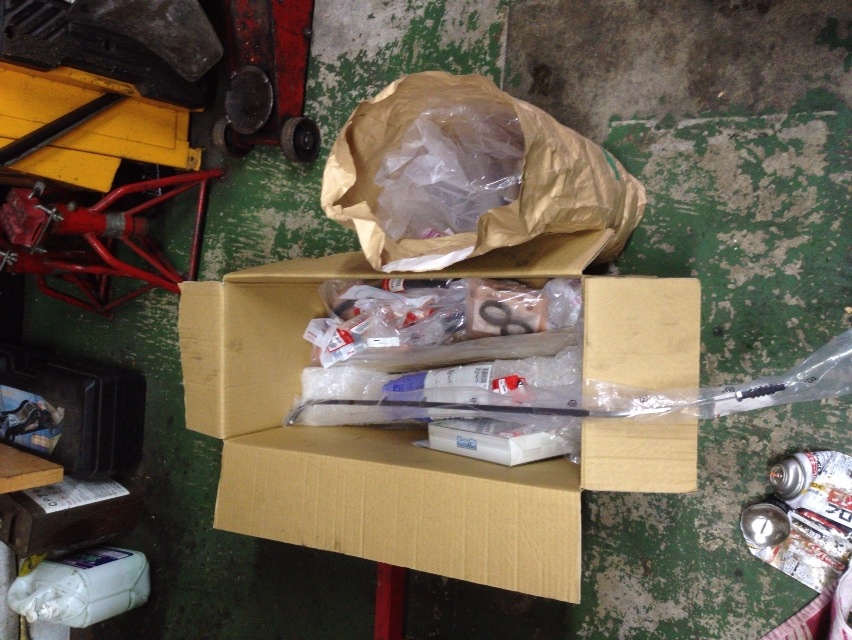 すぐ隣りに置かれた段ボール箱にはこれから交換されるパーツの山が…。