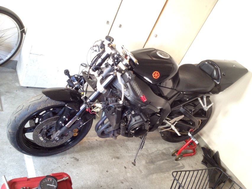 最後にR1に乗ったのは筑波で急に雨が降って1コーナーでズッコケた日なので、もう3ヶ月以上R1に乗っていないのだけど、元監督のガレージで何か作業するたびにR1の整備もチョイチョイしといたので調子はかなり良い。はずだ。