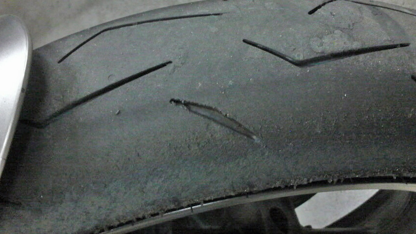 あとは微妙に使っちゃった端っこはどうなのか?ってトコなんですけども、チラッと調べてみたところ、バイクはすべての溝が0.8mm以上残ってないと車検不合格ってコトなのらしい。