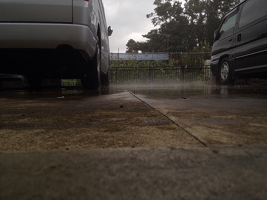 で、作業を開始してすぐに空が怪しい感じになってきて、その上ゴロゴロ言い出したので、普段はガレージの外に何台かバイクを出しておくのだけど、今日はテトリスのようにバイクをアッチコッチと動かして、外に出さないでおいたらば、1時間もしない内にココはホントに日本なのか!?と目を疑う程のスコール。
