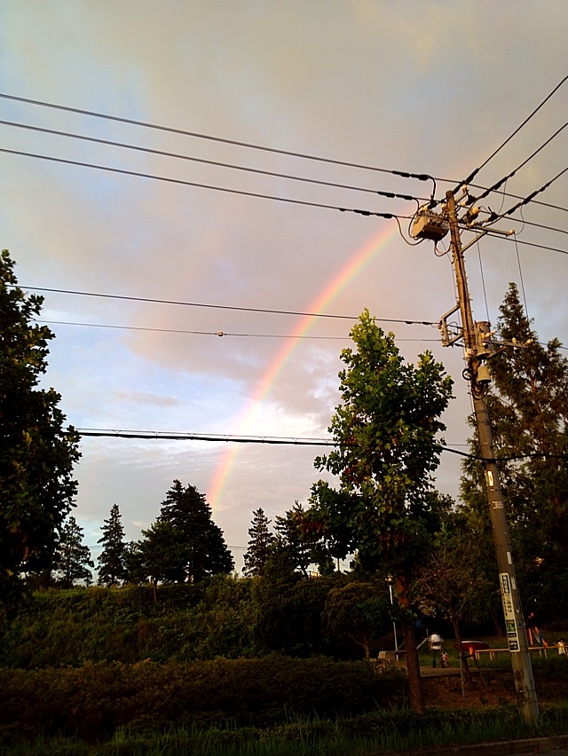 写真には撮れなかったのだけど、肉眼ではもっと多くの色が見えて、しかもこの虹の外にもうひと回り大きな虹が掛かって2重になってたの!