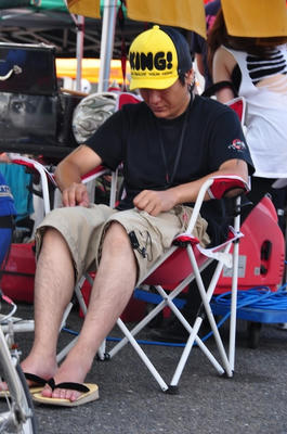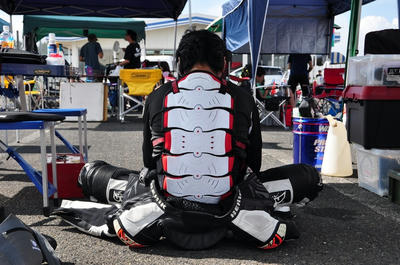 予選寸前の1コマで、OKR夫妻とタケロシくんがウェイティングエリアにR600を運んで準備してくれてる間、僕はストレッチをしながら脳内筑波を激走中。