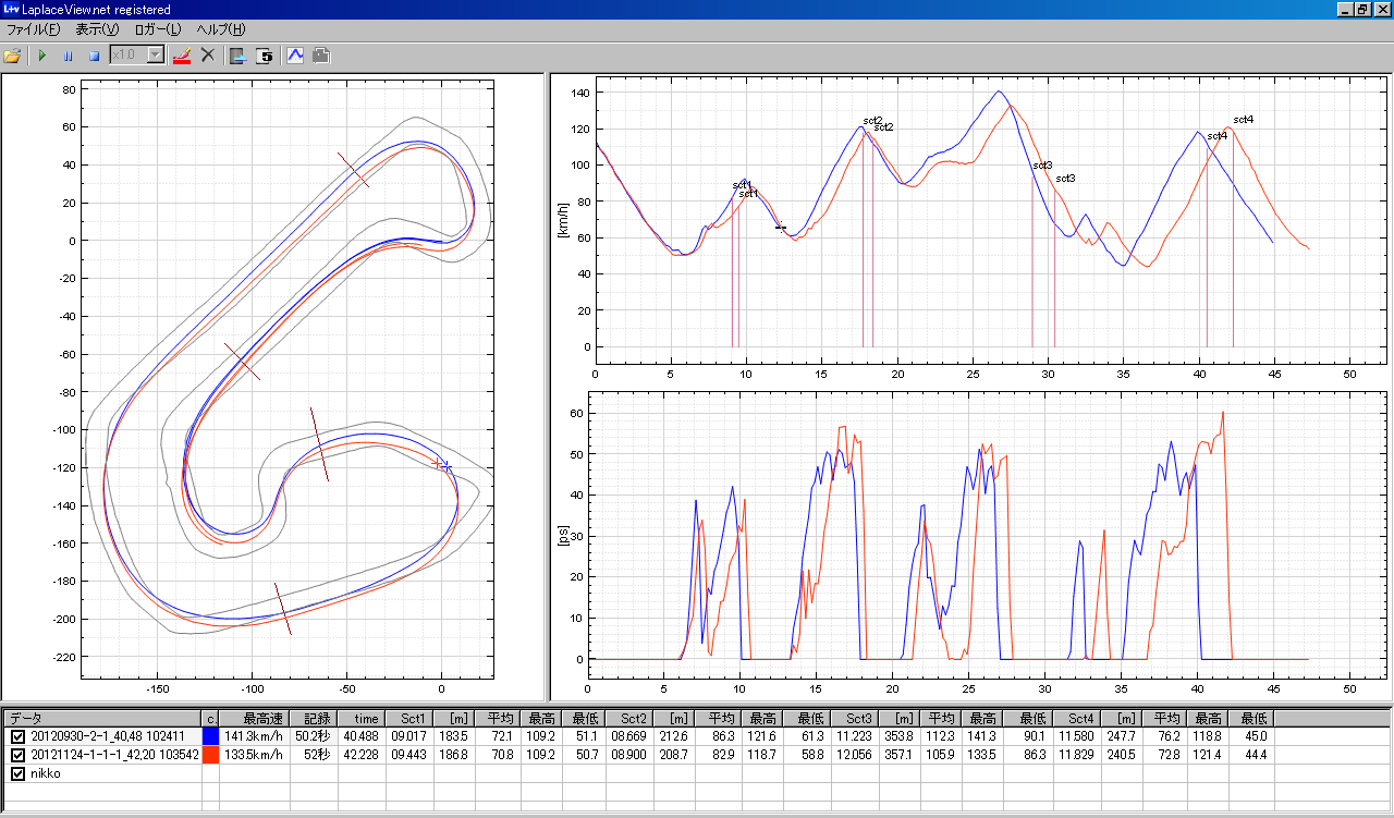 青い線が最終戦の時の40秒5とかそのくらいの時のでこれが現在の自己ベスト、赤い線が先週末のベストで42秒の3とかなんですけども、まず通ってるラインがだいぶ違う。