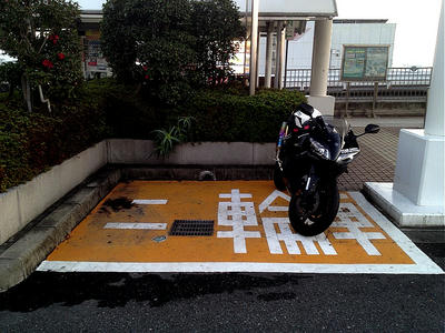 ココの2輪の駐車場は小さいのだけど、車の駐車場が滅多なコトではいっぱいにならないので、特に2輪のトコに停める必要もないのだけど…なんとなく。その上やっぱり端っこにf(^_^;)