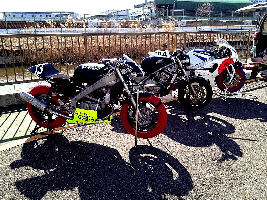 で、今日はリアに前回の練習で右がうっすらとスリップサイン出掛かってるタイヤを逆履きしてたんですけども、朝イチの9時からの走行はホント心が折れそうなくらいグリップしなくて、そこら中のコーナーでドリフト。ドリフ。志村うしろうしろ。