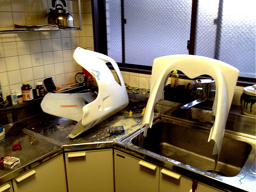 これからカウルを塗るとなると、サフェーサーを塗って研いで、色を載せて研いで、クリアを載せて研いで…と、結構な回数キッチンで同じ作業をするコトになりそうだし、次回からはお風呂で塗装した時と同じ作戦でちゃんと養生しようと、そんな風に思いますf(^_^;)