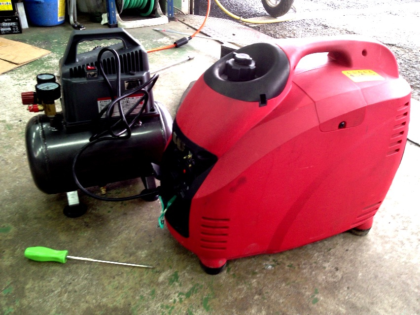 で、先日のレース時にオイル交換しても調子が悪かった発電機を社長が『直そうぜ!』ってコトで、いろいろ見てくれたんですけども、電気関係の配線がちょいちょい面白いコトになっていたのと、プラグもちょっとアレだったりで直したり交換したり。エアクリーナーの辺りのチェックとオイルも念のためもう1度交換してくれて、掛けてみるとそれはもうビックリする程安定して電気を生み出しつつ、回転数もまったく泳がずバッチリ安定してる!!スゲー!!