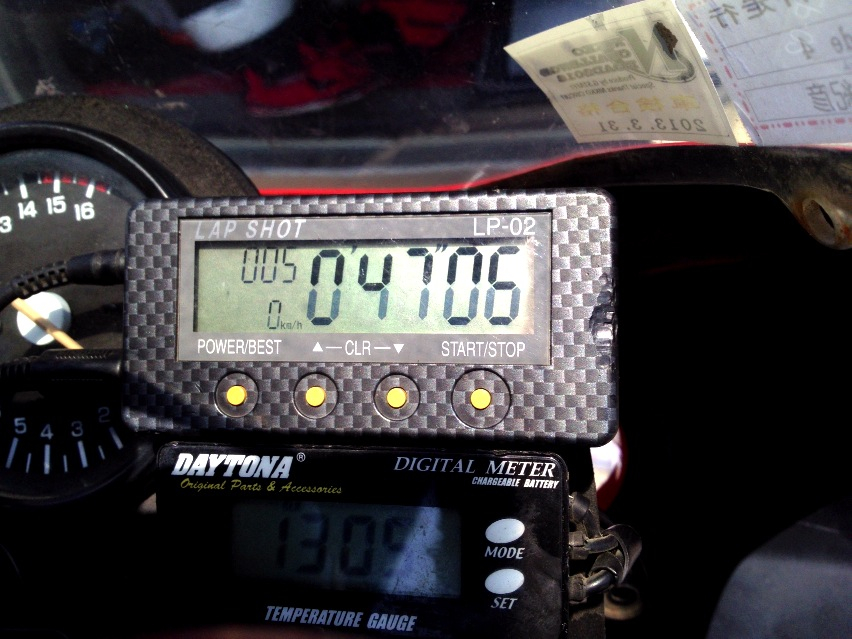 2速のままストレートエンドまで引っ張って14,500rpmくらいだったのでそこだけは良いのだけど、それ以外はどうにもならないっていうか、桶スポのようなストップ&ゴーな低速コーナーを繰り返すようなコースではちょっと厳し過ぎたf(^_^;)