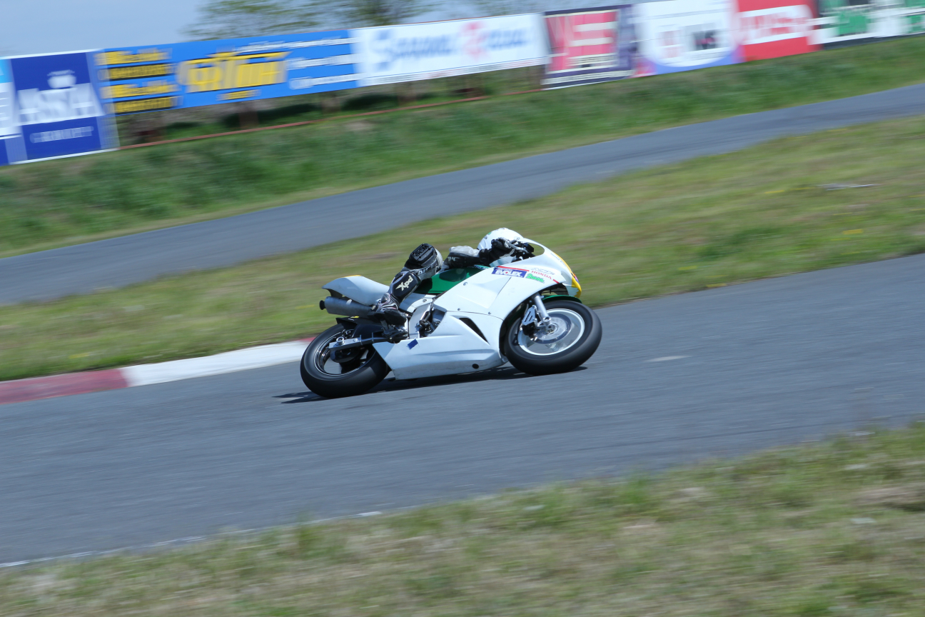 コレは最終手前の左から最終の右に切り返す瞬間でバイクも起きてるし体重移動の途中で身体も真ん中にいるので、ライダーとしては見てもあまり面白くないのかも知れないんですけどね、このヘルメットの違和感っていうか、ドロッと流れてる背景にヘルメットをポンと置いたような感じっていうんですかね…。こういうのずっと撮りたかったんです!