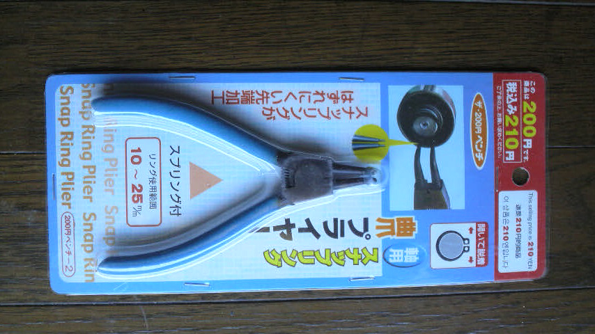 で、メンテナンススタンドを前後揃えてからはチェーンと同じようにキャリパーのメンテの頻度も上がっているので、そろそろ専用工具を買おうかと思ってたんですけども、握った時に開いて先が曲がっててピストンの内側に傷が入らなければ良いっていう条件なら代用出来る良いのがあんじゃないすか!って思ってですね、ちょっと前に仕事の帰りに100円ショップで買って来てあったのがあったんで試してみましたよ。