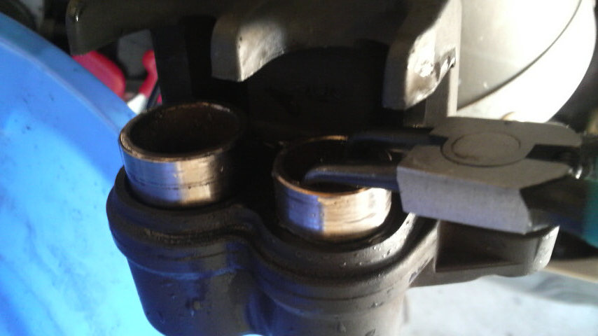 で、ピストンを一回りゴシゴシするには、どうしてもブラシが入り辛いトコが出て来るんで、ピストンを回して汚れてる面を出してくるんですけども、キャリパーピストンツールがないと手持ちの工具で色々工夫しないといかんのでとても面倒。イラっとする時もある。