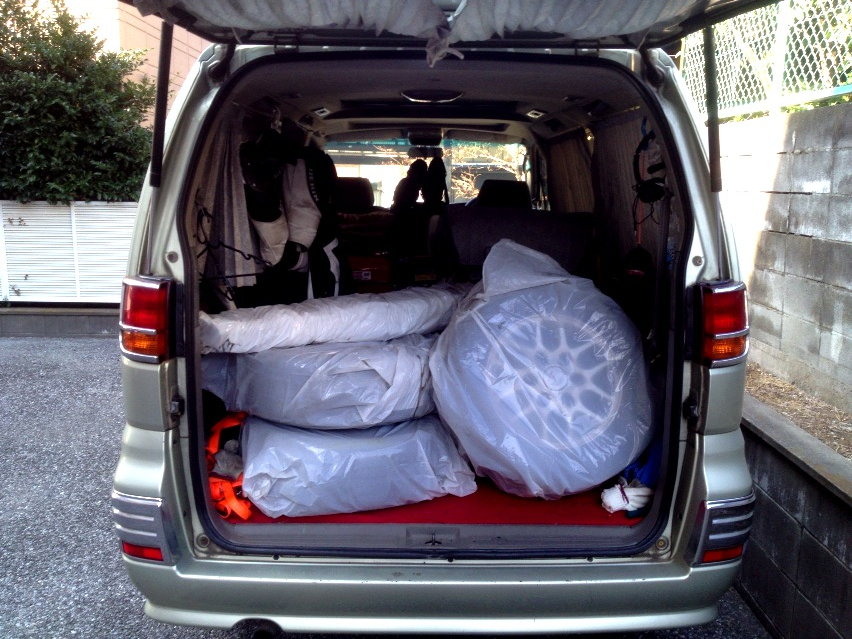 車に載ってたVFRとラダーレールやら自転車やらを降ろして荷物を積み込んだらもう汗だく。
