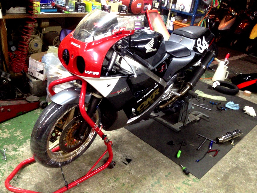 最終戦の時点で僕のVFRはOKR社長の睡眠時間と侠気がフルにつぎ込まれた極悪GPマフラー(メーカー不明)と直キャブ仕様だったんですけども、音量が大きめなので桶スポやトミンでは走らせてもらえなそうだし、気温や湿度に物凄い影響を受けるのに僕が自分でセッティング出来ないのと、練習中にその作業をする心の余裕がないってのとで、パワーを削ってもある程度オールラウンダーなバイクにしておきたいってコトで、社長に無理言って元から着いてたインナーパイプ極細のTSRのサイレンサーとエアクリボックス仕様に戻してもらった。キャブも社長が少しでも良いものをって頑張ってくれたスペシャルゴニョゴニョ仕様からノーマルに。