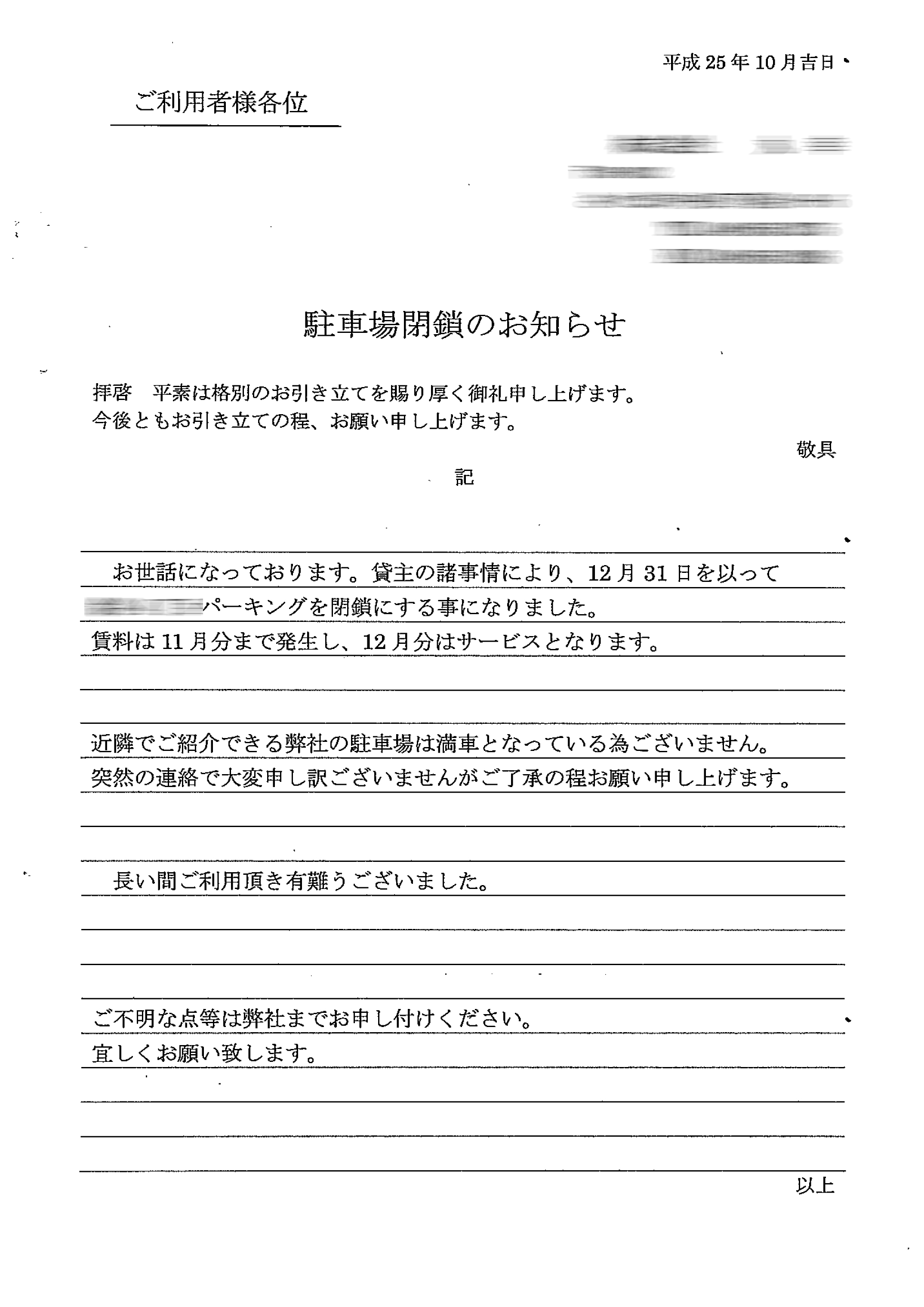 2ヶ月以上前に告知すればOKっていうのも法律で決まってる話しですし、それよりも次の駐車場をどうするかを年内に考えないといかんのです…。