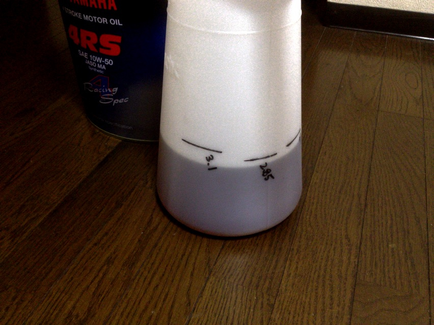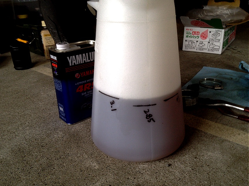 そんで、オイルはずいぶん前にペール缶で買ったヤマルーブの4RSがあと1回行けるはずだと思っていて、フィルターも買い置きがあるので、あとは作業するだけだったんですけども、ふと気になってジョッキに移してみたらば微妙に足りない…orz