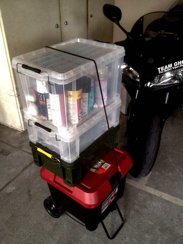 近頃はマンションの駐輪場でR1を整備するよりもサーキットでVFRを弄る機会の方が圧倒的に多いので、いつの間にか車から降ろさなくなったんですけども、一昨日みたいにたまにR1に何かしようとすると、逆に車から工具をおろしてくるコトになる。