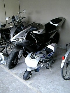 で、今のちゃりんこには特に不満もないし、困ったコトもまったくないのだけど、僕もちょっと楽しげな移動手段を持って行きたいなぁ…と思っていろいろ考えてたんですけども、そういえば自分のR1に似てるって理由で衝動買いしたチャイナのポケバイがあるなぁ…と。