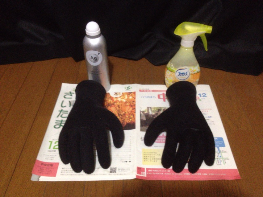 グローブをひっくり返してAg+は満遍なく、ファブリーズは全体が湿る程度に吹きかけておいた。