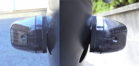 そんで帰って来て駐車場で元の両面テープを剥がしてカウルに押し当てながら、あぁでもないこうでもないと色々試してみたところ、膨らんでる方を後ろにしてかなり斜めにしたトコでだいぶ平面に近いポジションがみつかったので貼付けてみた。