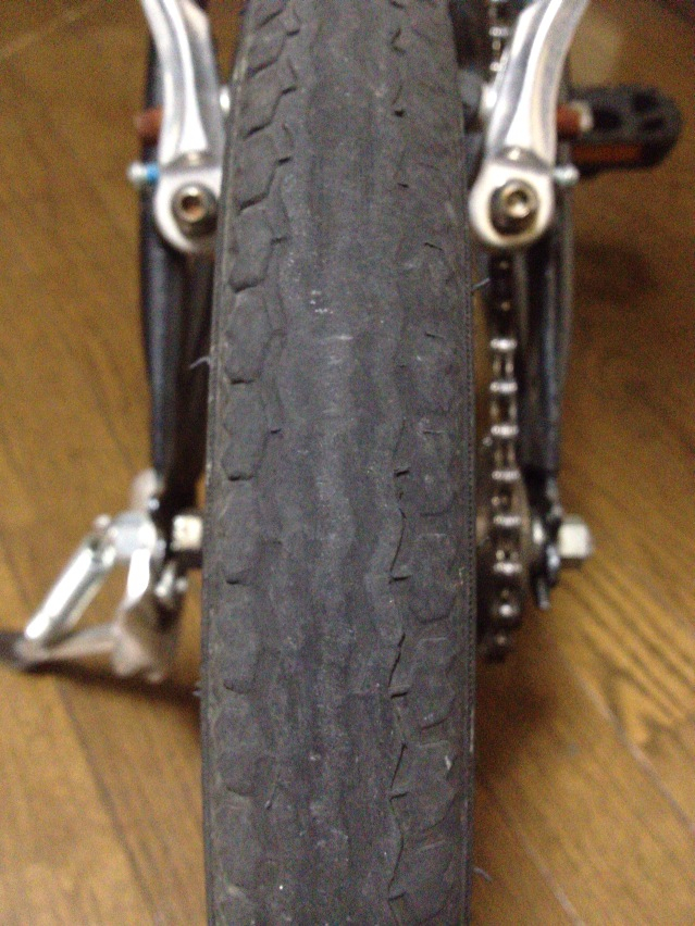 チューブの補修剤はまだ余ってるので修理するか…と思いつつ、タイヤを見るとツルッツルの坊主状態。