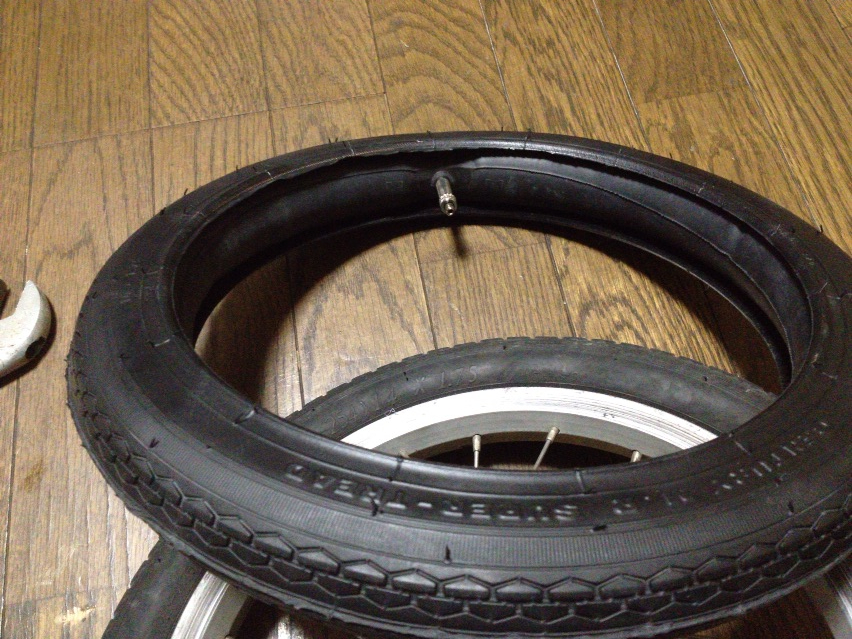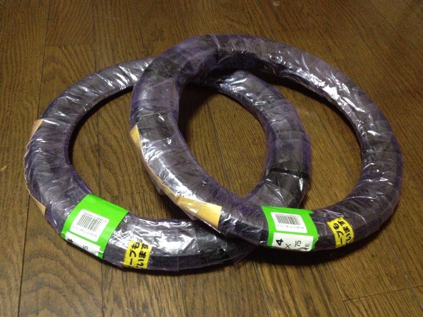 ちゃりんこコーナーを物色していると、丁度同じサイズ(14x1.75)が2本あったので、ついでに前後交換するコトにして2本買って来た。