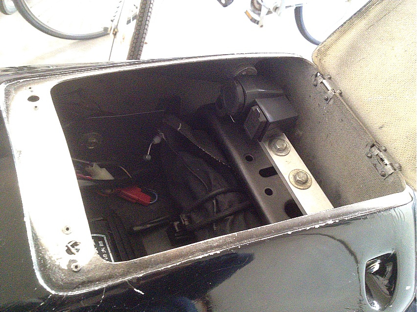 連休初日の今日はですね、前々から計画してたバイクで移動中にiPhoneを充電できるようにする計画を試してみようって訳で、まずはシート下に固定出来る場所があるかを確認してみた。