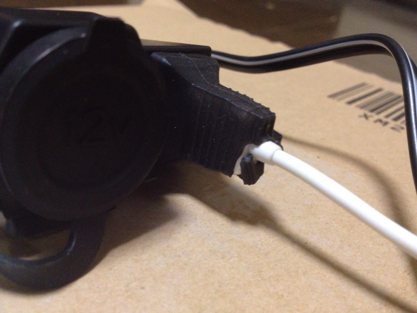 そんでですね、今回買ってみたシガーソケットには、USBを接続する時の防塵用にダストカバーみたいなのがついてきたんですけども、針で小さな穴を開けて広げつつUSBのコネクタを通してみたらば…