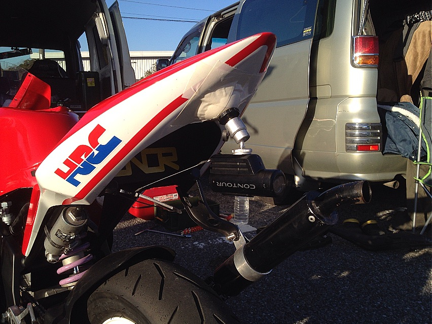 ところが、やっぱりエンジンはまったく伸びないのでまともなタイムも出せず、せっかくなのでエキスパートな方々にラップされまくる様を動画に収めようっていうコトで、初めて後方カメラを取り付けてみました(笑)