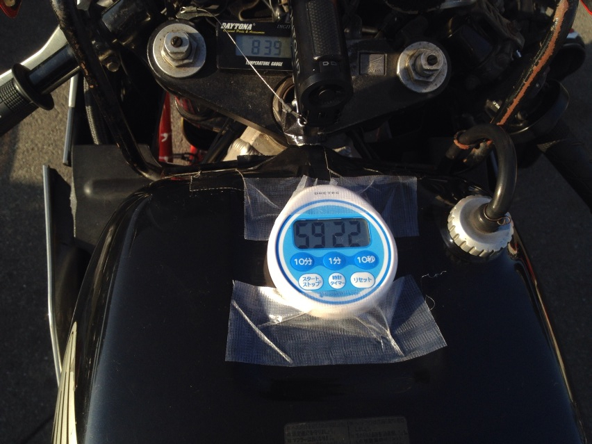 風呂で半身浴する時に使ってるヤツを持ってって、スタートする時に60分からピってしといて、『げー!まだ30分経ってねぇのかっ!!』とか『あと20分…練習走行1本分…』とか、『あーと5ーふんー♪あーと5ーふんー♪』とかやってたらあっという間に1時間経ってしまった。