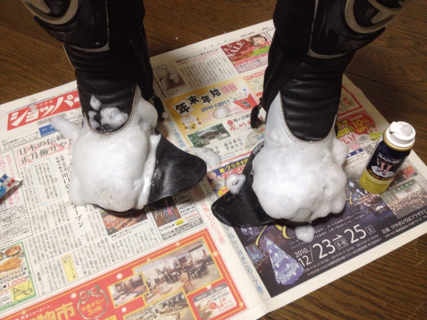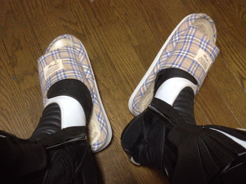 スプレーの説明によるとこの状態で歩き回れって書いてあるんですけども、部屋の中でブーツを履いて歩いていると音がうるさくて、下の階の人に迷惑を掛けてしまいそうなのでスリッパをオン。