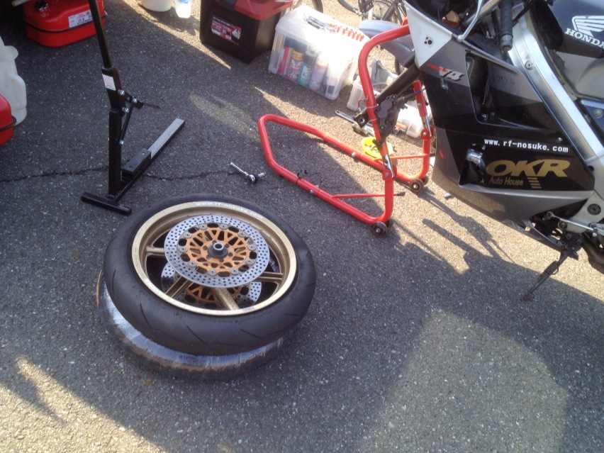 交換するタイヤは、いつぞやのakashitimiさん経由でR1用に中古で譲ってもらったディアスコV2です。NC30に入れてしまいます。背に腹は変えられないのです。